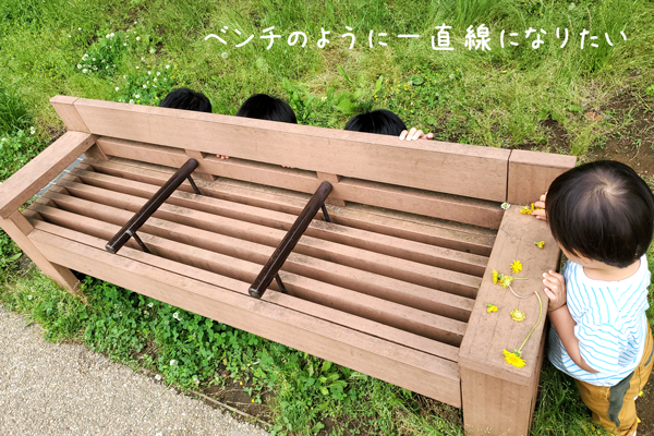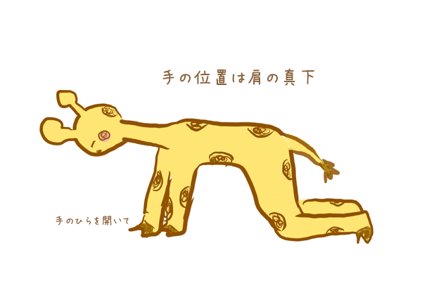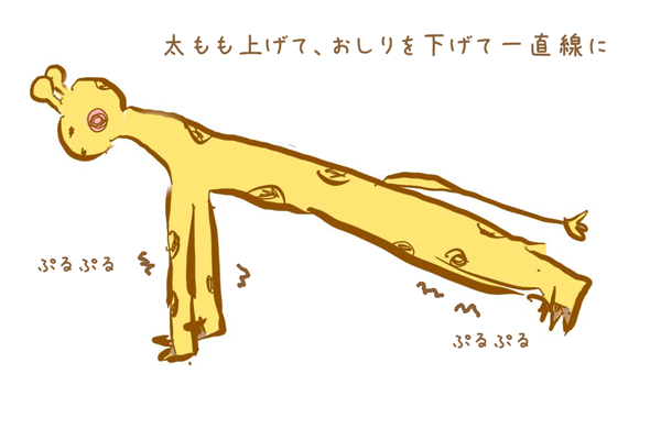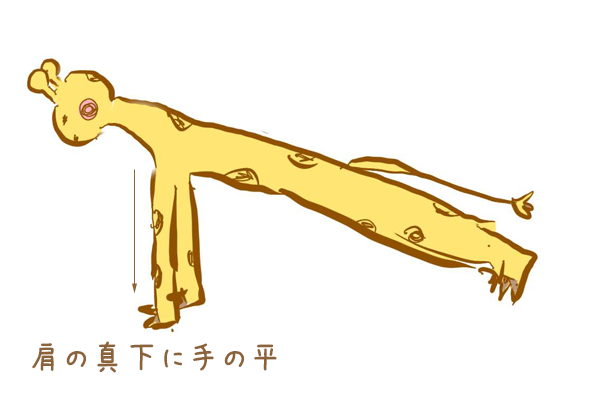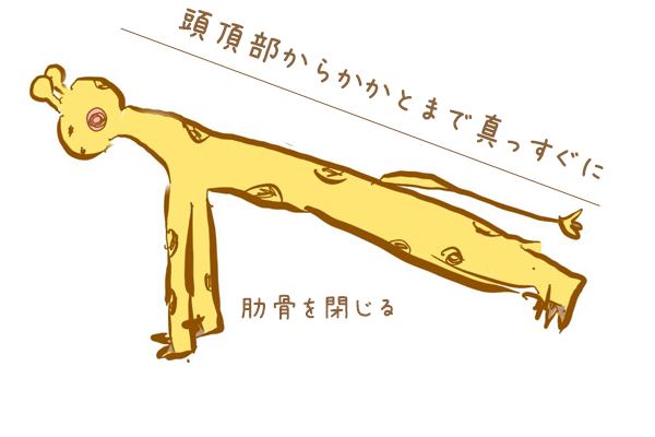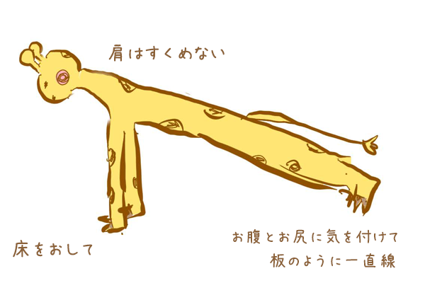 頭の先からかかとまでを一直線に。お腹と背中で体をささえるよ。腕立てする時のポーズだね