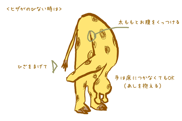 - あせらず、まずはお腹と太ももがぴったりつくまで膝を曲げる所からはじめてみてください。お腹と太ももをくっつけたままヒザを少しずつ伸ばすしていく(痛気持ち良い所まで)、だんだんと太もも裏側の筋肉の伸ばし方を体に覚えさせていきましょう。