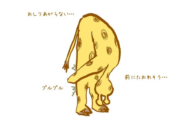 しょうがない、ひざを曲げよう…それでも手が床につかない…しょうがない、ひざのうしろでひじを抱えるか…